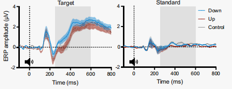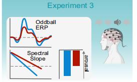 实验3将瞳孔生物反馈与脑电相结合,研究瞳孔自我调节如何影响目标音调的谱斜率和P300事件相关电位(ERP)成分,这是蓝斑(LC)活动的电生理标志物。研究假设瞳孔缩小(蓝色)时的斜度比瞳孔放大(红色)时的斜度更陡,并进一步研究斜度是否会随着目标色调的变化而变化。此外,研究假设当受试者在目标音调之前瞳孔缩小(蓝色)时,P300会比瞳孔放大(红色)时更大。图4中的声音图标代表在oddball任务中播放的标准(浅灰色)和目标音调(深灰色)(图4)。