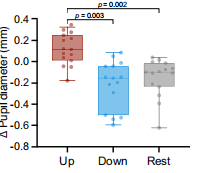 注:在上调期间,修正后的基线瞳孔大小变化明显大于下调和对照试验组;下调期间的瞳孔大小变化没有显著低于对照组。