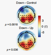 在下调和控制条件下,P300 的表现存在显著差异(图12-14),这种差异表现为,在整个中央顶叶区域,下调的幅度高于对照条件的调节幅度,并且这种差异在声音开始后的 252 至 560 毫秒之间最为显著,这与 P300 的预期时间特性和空间特性相吻合。同时,下调和上调条件之间的 P300 也有显著差异。但是,P300在上调和控制条件之间没有显著差异。