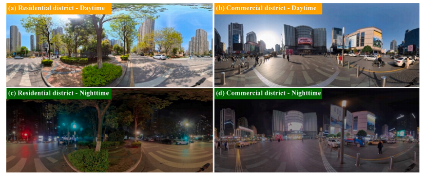 本研究采用2×2混合实验设计,城区(住宅区与商业区,即RD vs. CD)作为受试者内部变量,光环境(白天vs.夜间)作为受试者间变量。将43名受试者随机分配到4个场景中的两个。